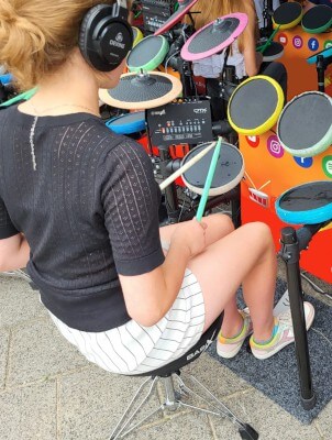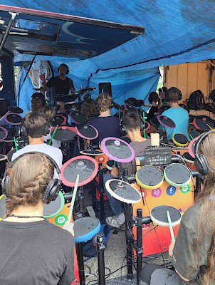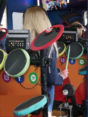 In de Workshop Elektronisch Drummen mag een hele groep jongeren plaatsnemen achter echte elektronische drumstellen. Ze leren zelf ritmes spelen en met bekende popsongs meedrummen.
