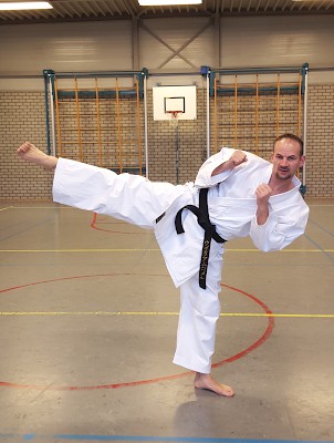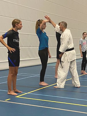 Na rekken en strekken gaan we met echte karate technieken aan de slag zoals de mae geri (voorwaartse trap) en choku tsuki (rechtstreekse vuiststoot).
