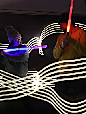 Jullie tekenen met licht in een verduisterde ruimte voor een camera met lange sluitertijd. De foto’s worden het aandenken.