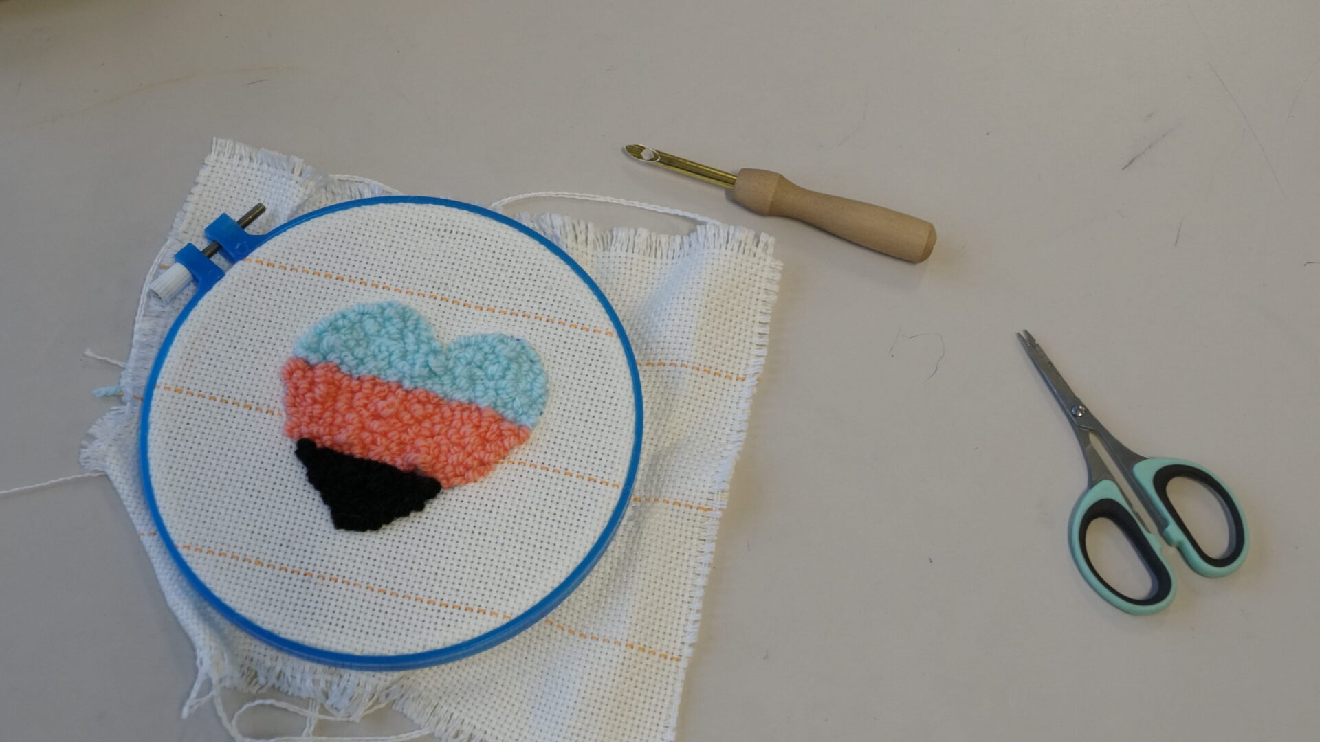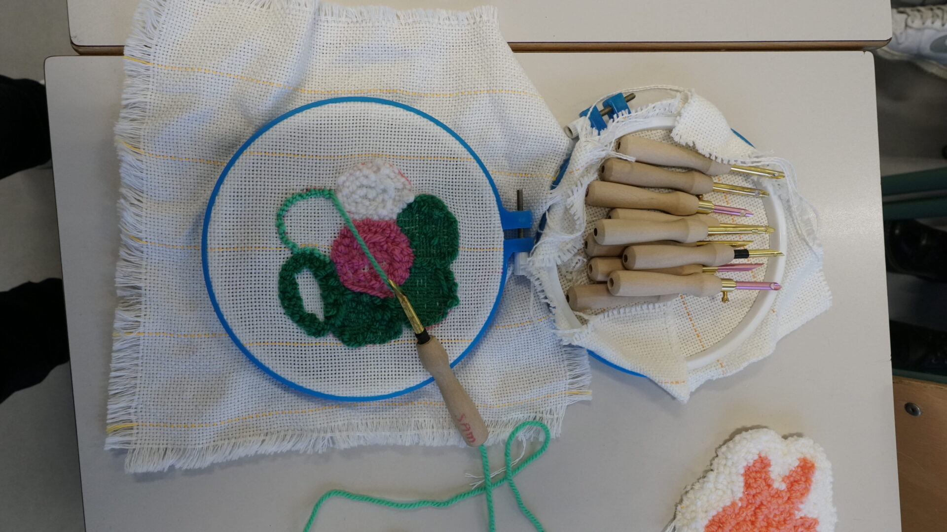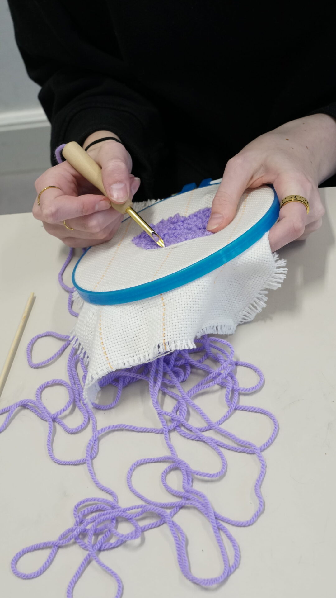 De workshop begint met een korte uitleg over de veiligheid en de techniek. Daarna gaan de deelnemers direct aan de slag. Ze maken eerst een ontwerp op het doek: van organische vormen tot strakke letters of hun eigen ’tag’. Vervolgens kiezen ze hun kleuren wol en pakken ze de tufting naald erbij.